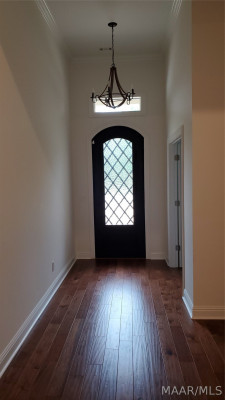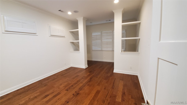 Quality construction and energy-efficient features include spray foam insulation, Low-E windows, a tankless gas water heater, and a gas log fireplace with electric switch igniter. Hardwood flooring extends through all common areas, while tile finishes are featured in bathrooms, showers, and the laundry room. The home is also pre-wired for a security system and surround sound.
