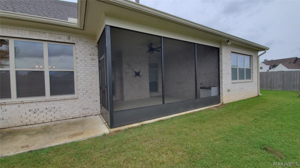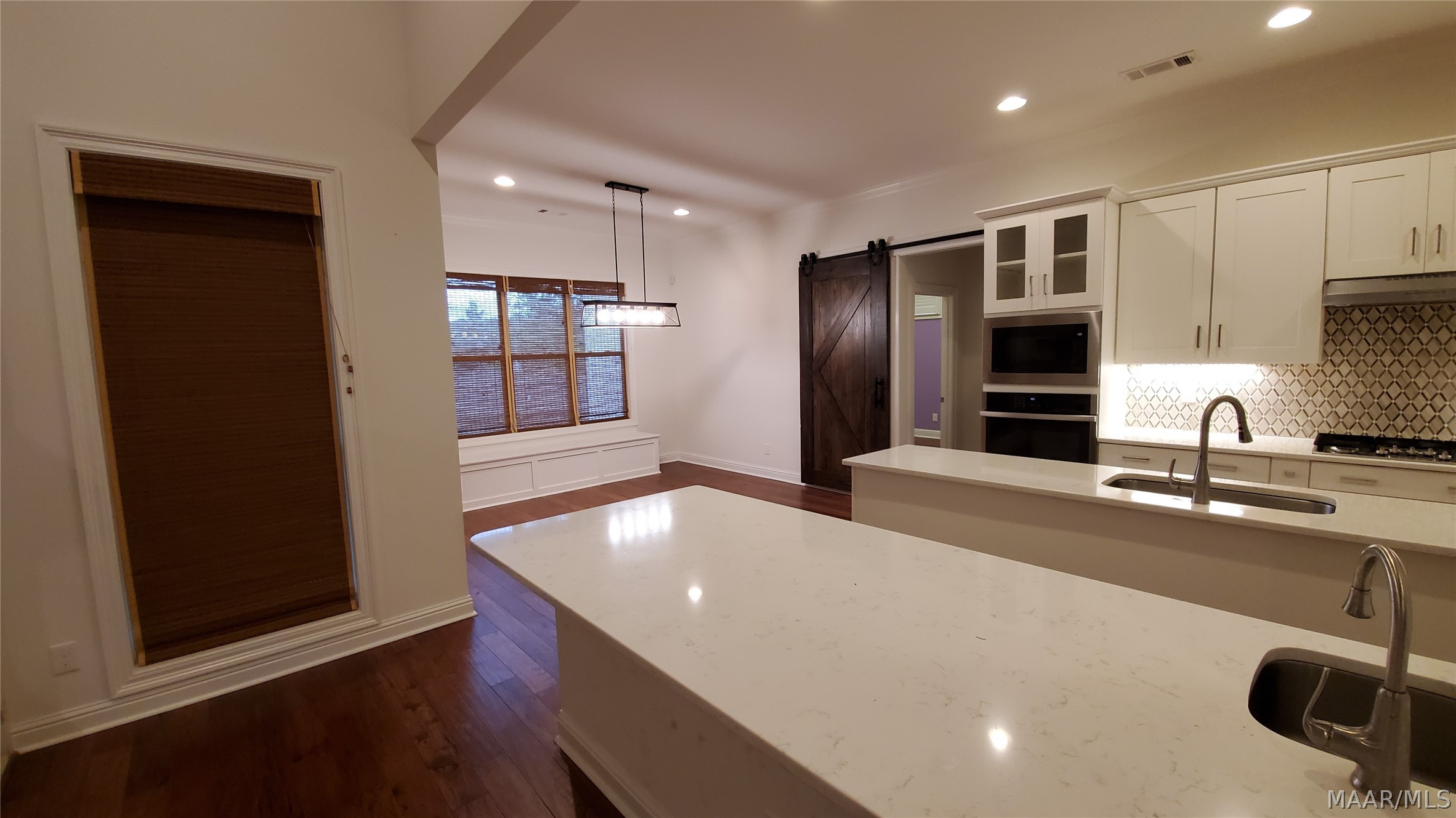 The spacious living area flows seamlessly into the well-appointed kitchen, which features a large island workspace, custom vent hood, granite countertops, solid wood cabinetry with soft-close drawers, and a generous walk-in pantry. A bright breakfast room with double doors opens to an expansive covered, screened-in back porch—perfect for relaxing or entertaining guests.