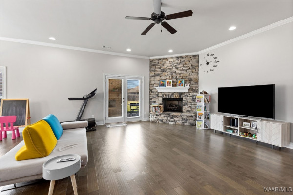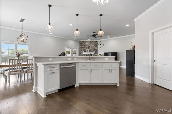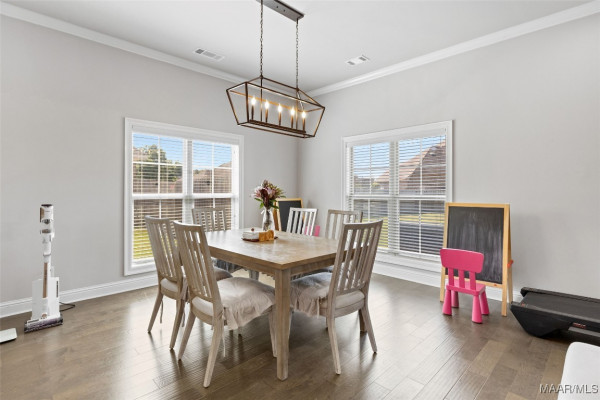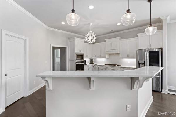 Inside, you’ll find engineered hardwood floors in the main living areas, tall ceilings, and an open layout perfect for entertaining and everyday living. The great room features a cozy fireplace and flows seamlessly into the chef’s kitchen, which showcases quartz countertops, stainless steel appliances, custom cabinetry, an oversized island, and a walk-in pantry. A formal dining space and breakfast area provide flexibility for hosting and daily meals.