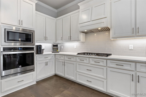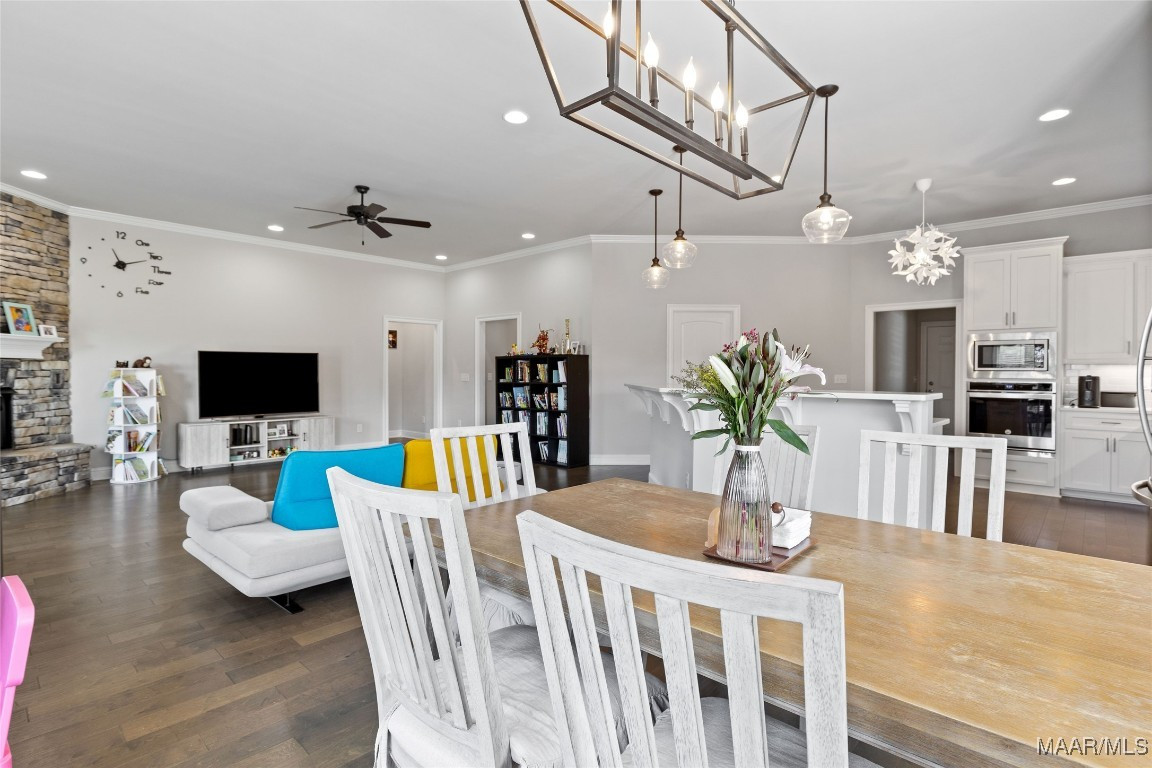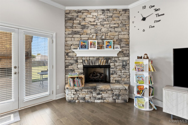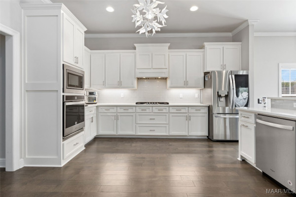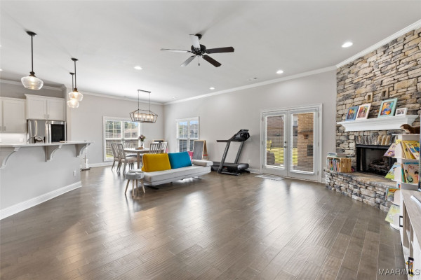 Inside, you’ll find engineered hardwood floors in the main living areas, tall ceilings, and an open layout perfect for entertaining and everyday living. The great room features a cozy fireplace and flows seamlessly into the chef’s kitchen, which showcases quartz countertops, stainless steel appliances, custom cabinetry, an oversized island, and a walk-in pantry. A formal dining space and breakfast area provide flexibility for hosting and daily meals.