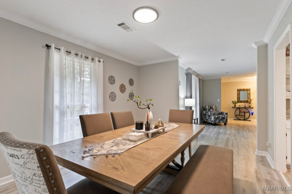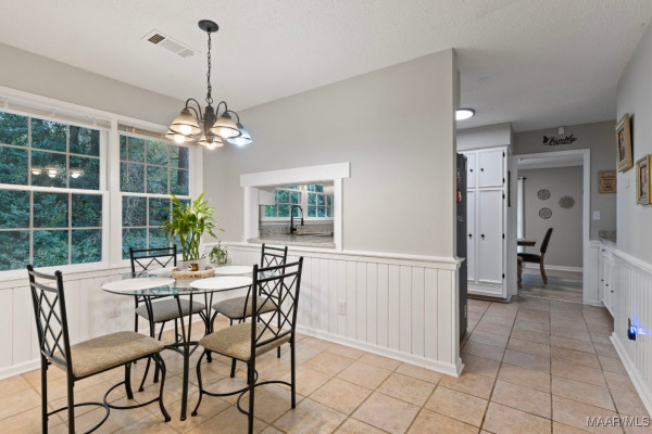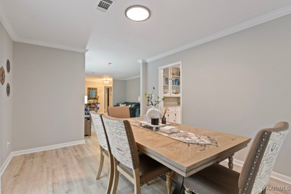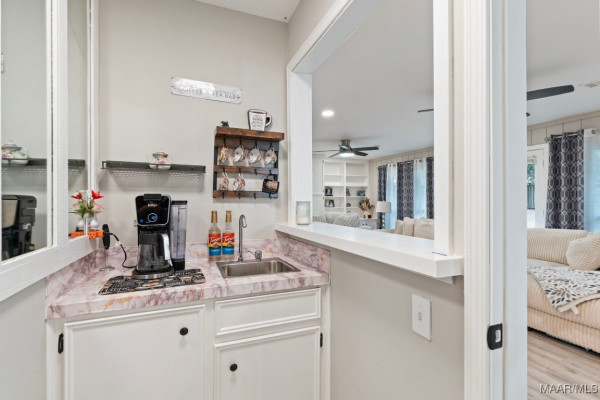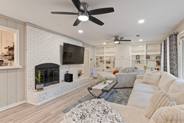 If you head straight from the foyer, you’ll discover a spacious family room with a cozy brick fireplace and stunning floor-to-ceiling built-ins. Tucked just off this room is a charming wet bar/coffee bar complete with a sink, perfect for entertaining or that morning java ritual.