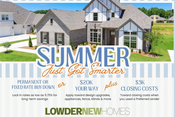 Offer valid on select homes and for a limited time only. Incentive includes $20,000 to be used towards buyer’s choice of available upgrades, financing options, or approved items through builder, plus $5,000 in closing costs when financing with a Lowder New Homes preferred lender. $5,000 closing cost contribution may not be combined with any other third-party lender credits. Incentives are subject to change or withdrawal at any time without notice. Some restrictions apply. See a Lowder New Homes representative for details.