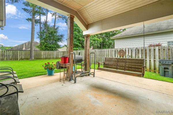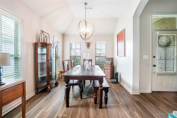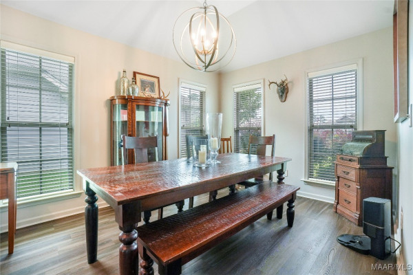 A dedicated dining space adds character with custom lighting and antique style details. The oversized backyard is fully fenced with plenty of room to entertain, garden, or play complete with a covered patio with room for a porch swing. The laundry room is smartly designed with upper cabinets and hanging storage.