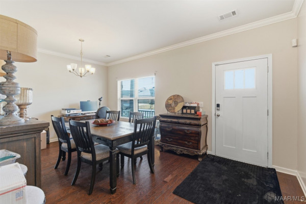 Step inside to an open, airy floor plan featuring hardwood flooring throughout the main living areas and plush carpet in the guest bedrooms for added comfort. The gourmet kitchen is the heart of the home, showcasing granite countertops, stainless-steel appliances, a large center island, and a seamless flow into the living room—perfect for gatherings and everyday living