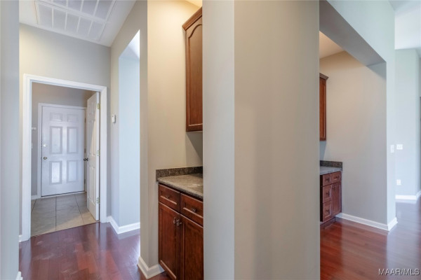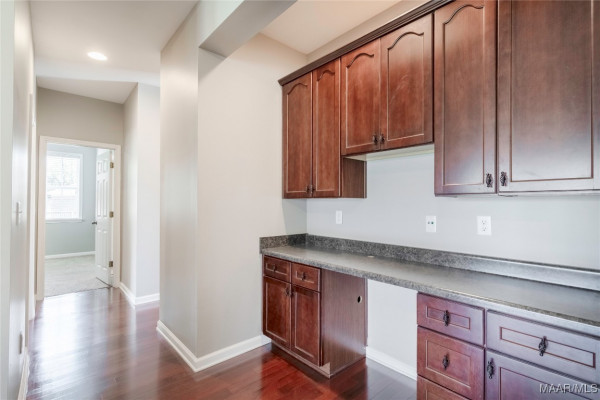 The kitchen is a chef’s delight with mahogany cabinets, solid-surface countertops, stainless steel appliances, a butler’s pantry, and upgraded lighting throughout. The spacious family room includes a built-in desk/computer area, making it ideal for both work and home organization. A flexible room off the foyer, complete with double doors, can serve as a formal living room, office, or bonus space.