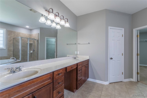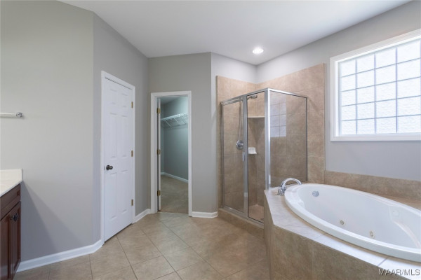 The luxurious master suite offers a Jacuzzi tub, tile shower, and double vanities. Additional upgrades include recessed lighting, custom fixtures, and thoughtful storage solutions.