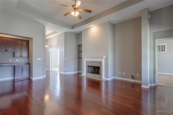 The kitchen is a chef’s delight with mahogany cabinets, solid-surface countertops, stainless steel appliances, a butler’s pantry, and upgraded lighting throughout. The spacious family room includes a built-in desk/computer area, making it ideal for both work and home organization. A flexible room off the foyer, complete with double doors, can serve as a formal living room, office, or bonus space.