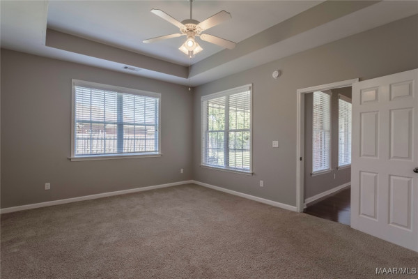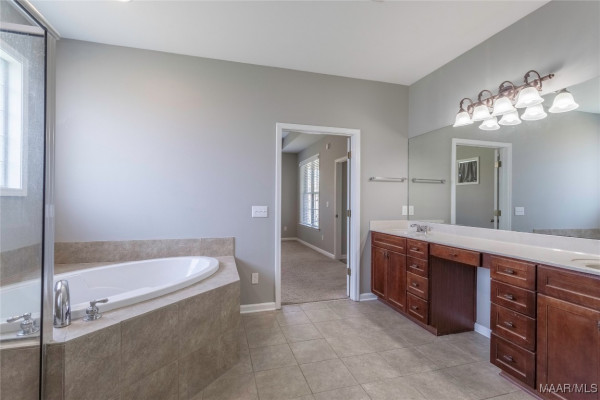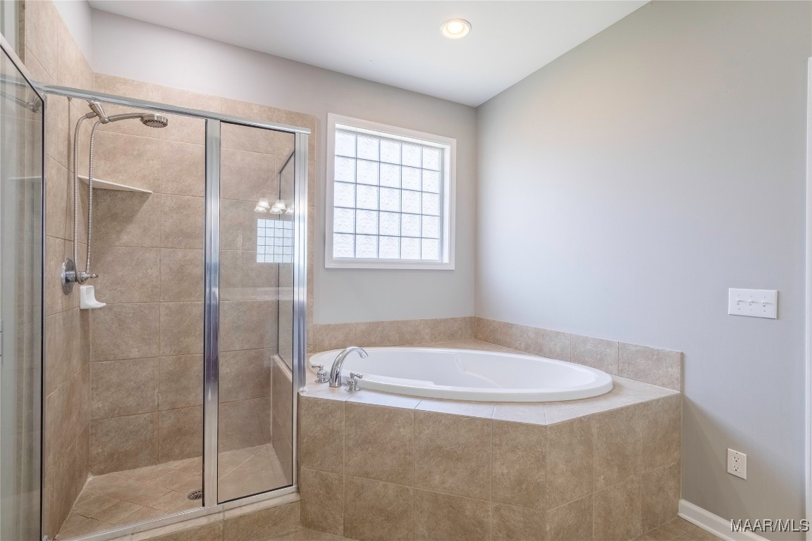 The luxurious master suite offers a Jacuzzi tub, tile shower, and double vanities. Additional upgrades include recessed lighting, custom fixtures, and thoughtful storage solutions.