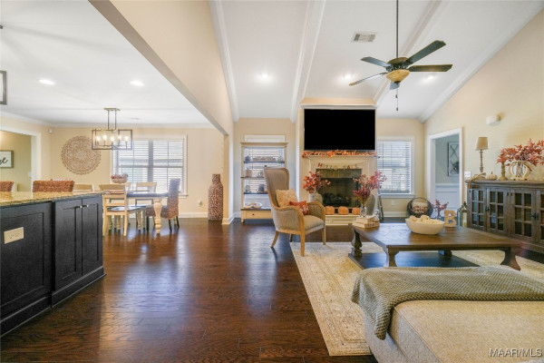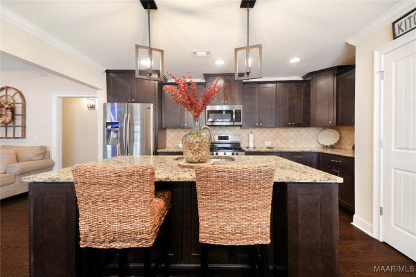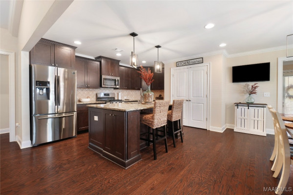 The main level boasts four spacious bedrooms and two full bathrooms. You’re greeted by a beautifully decorated foyer that leads into an open floor plan with wood floors throughout, perfect for entertaining family and friends. The chef’s kitchen features granite countertops, a gas cooktop, stainless steel appliances, and abundance of cabinetry for all your storage needs. Just off the kitchen, you’ll find three generously sized bedrooms with ample closet space, conveniently centered around a full guest bathroom.
