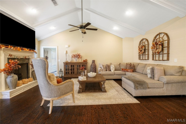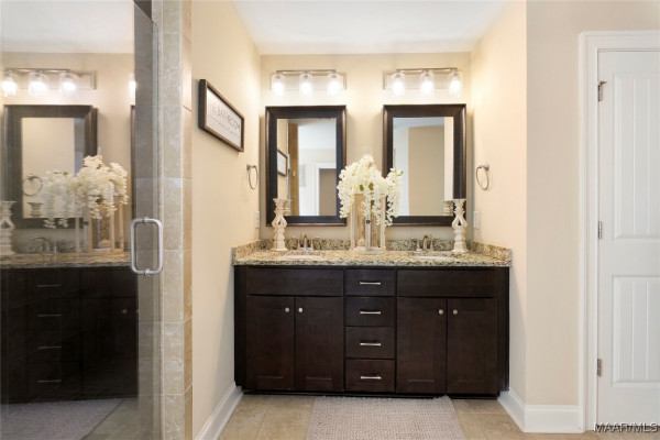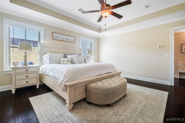 The primary suite is a true retreat with tray ceilings, hardwood flooring, and a large walk-in closet. The en-suite bathroom includes a walk-in shower, garden tub, double vanities, and a private water closet.