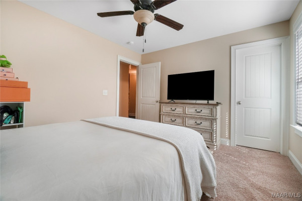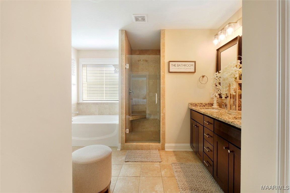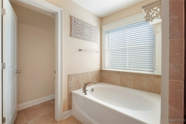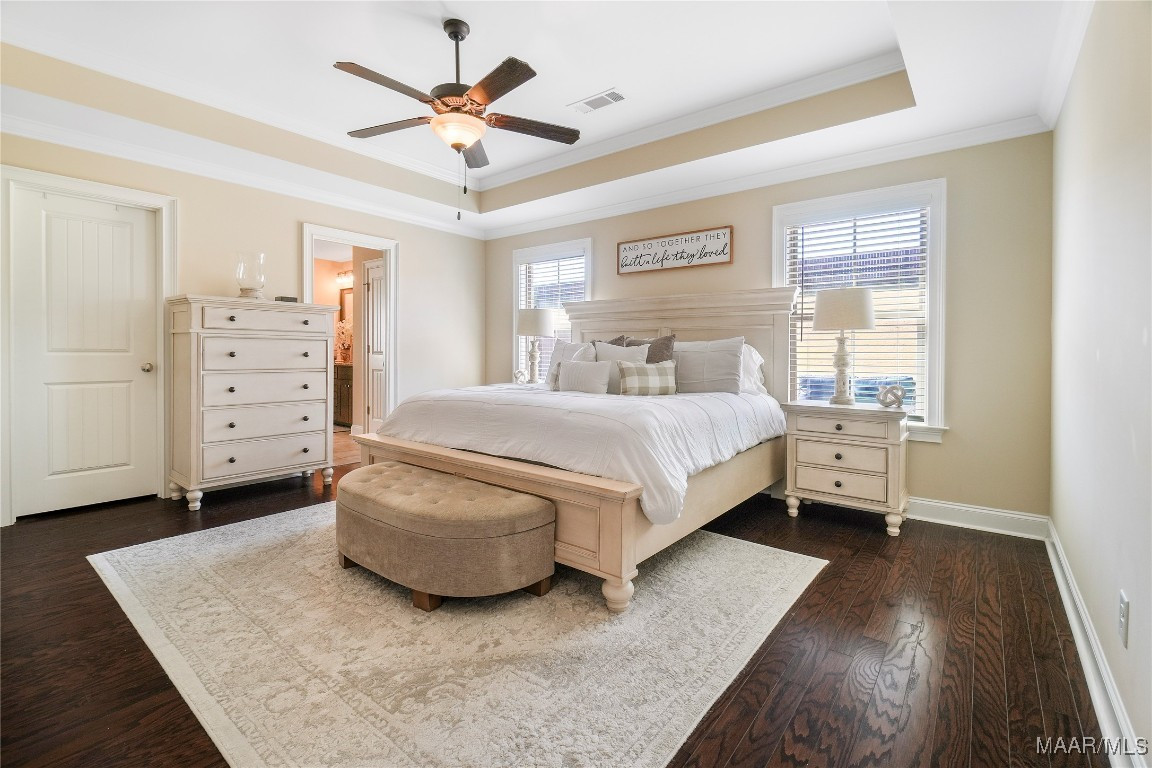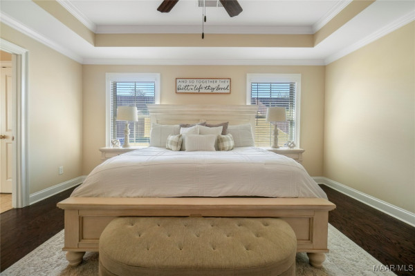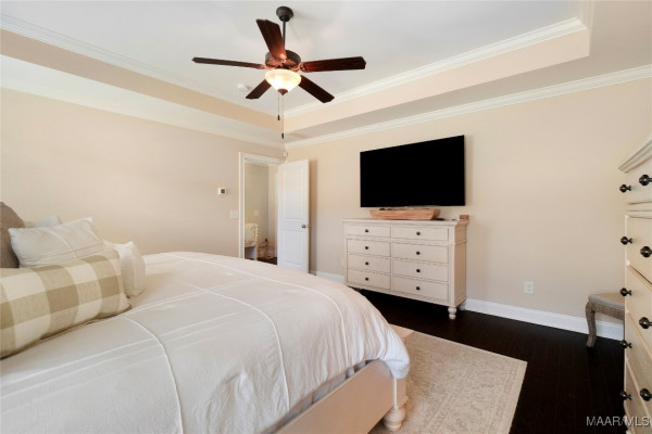 The primary suite is a true retreat with tray ceilings, hardwood flooring, and a large walk-in closet. The en-suite bathroom includes a walk-in shower, garden tub, double vanities, and a private water closet.