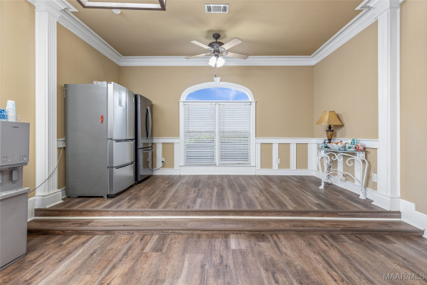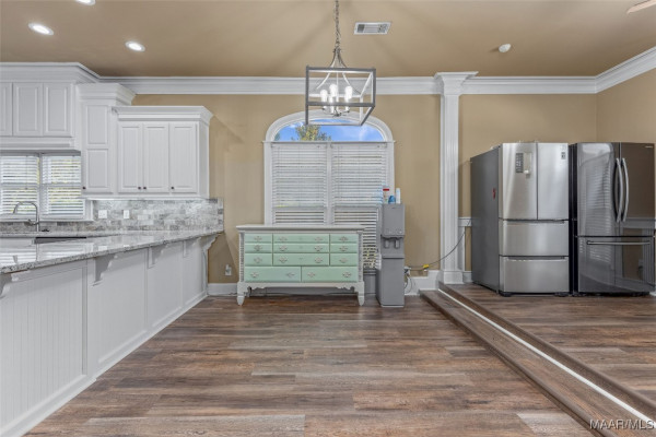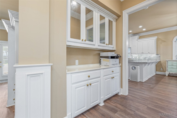 Step into the grand foyer and immediately notice the soaring ceilings, detailed crown and dental molding, and abundant natural light throughout the main living areas. A formal dining room and large home office flank the entry, while the expansive family room features a striking 12-foot mantle with gas fireplace. The chef’s kitchen has been beautifully refinished with new granite countertops and fresh paint, and features a large island with food warmer, gas cooktop, double ovens, countertop grill, oversized walk-in pantry, and a dedicated space for a built-in refrigerator. A keeping room and breakfast area provide additional gathering space.