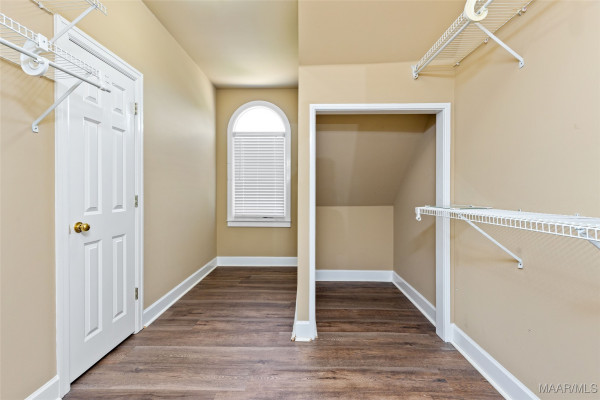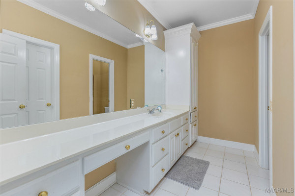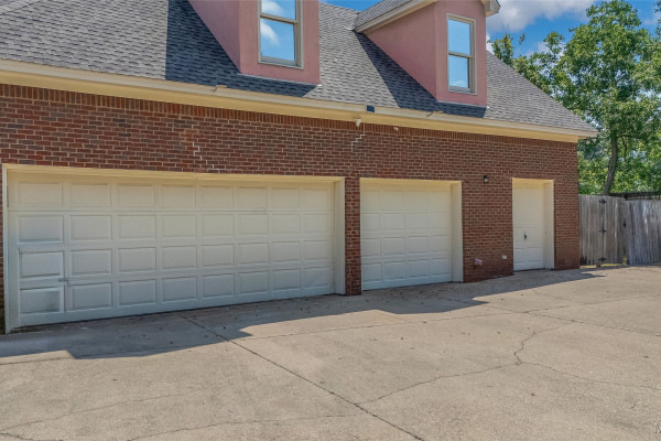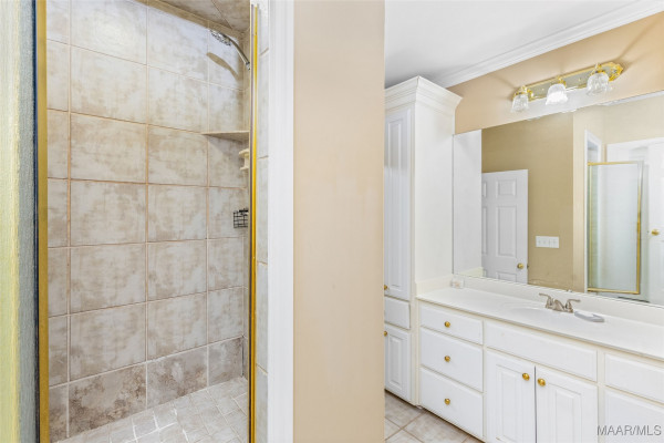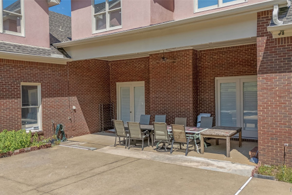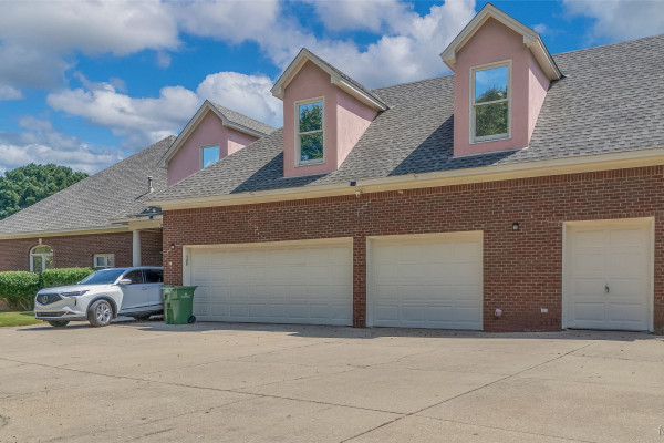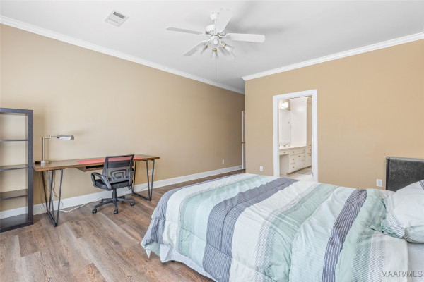 The main-level owner’s suite offers a private retreat with dual walk-in closets, double vanities, linen storage, a jetted tub, and an oversized double-head shower. Each of the additional bedrooms includes private bath access, with one bath featuring a convenient walk-in shower.