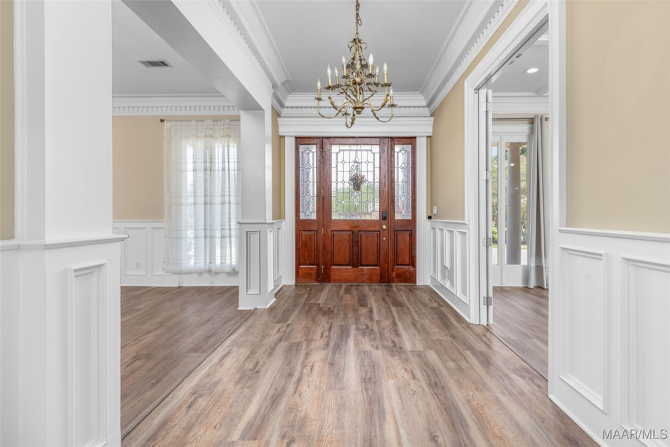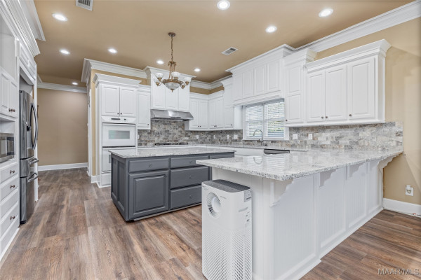Step into the grand foyer and immediately notice the soaring ceilings, detailed crown and dental molding, and abundant natural light throughout the main living areas. A formal dining room and large home office flank the entry, while the expansive family room features a striking 12-foot mantle with gas fireplace. The chef’s kitchen has been beautifully refinished with new granite countertops and fresh paint, and features a large island with food warmer, gas cooktop, double ovens, countertop grill, oversized walk-in pantry, and a dedicated space for a built-in refrigerator. A keeping room and breakfast area provide additional gathering space.