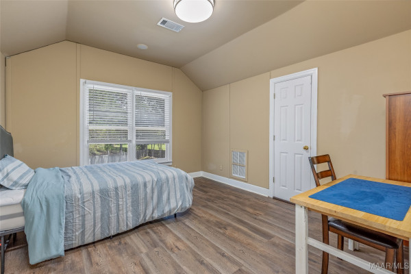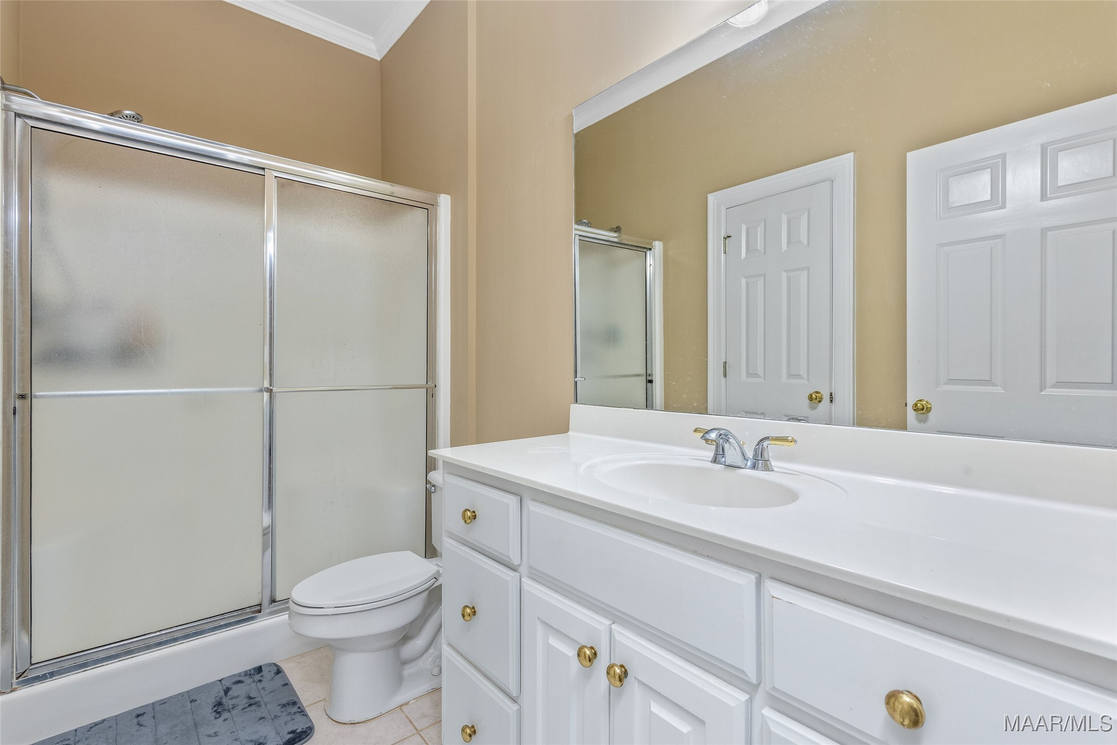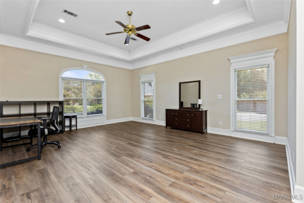 The main-level owner’s suite offers a private retreat with dual walk-in closets, double vanities, linen storage, a jetted tub, and an oversized double-head shower. Each of the additional bedrooms includes private bath access, with one bath featuring a convenient walk-in shower.