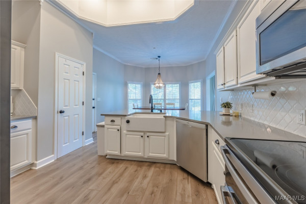 The interior features an oversized living room, tall ceilings, and a gas log fireplace that creates a warm and comfortable atmosphere. A formal dining room and a bonus space, currently used as a piano room, provide extra space for entertaining. The kitchen is designed to impress with quartz countertops, a stylish backsplash, a double oven, a pantry, and ample cabinet space. A sunroom overlooks the backyard and saltwater pool, making it the perfect spot to relax and enjoy the view.