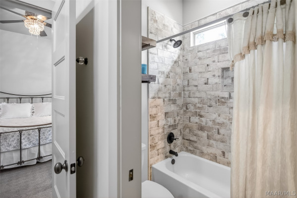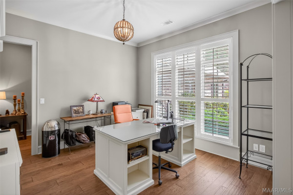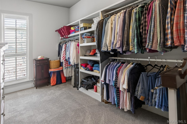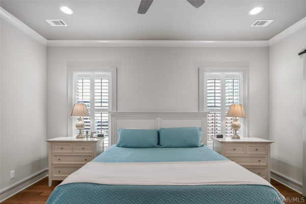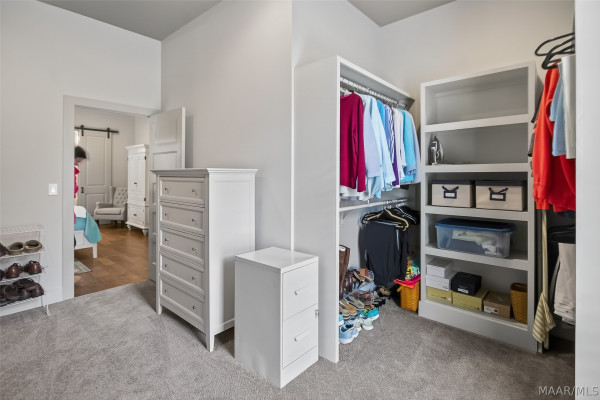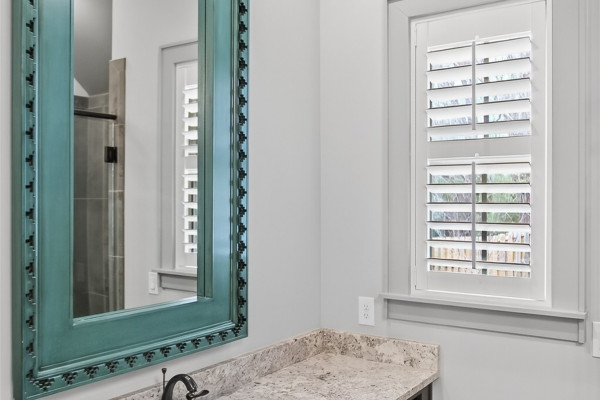 Luxury details include plantation shutters throughout, designer tile selections, upgraded carpet and pad, custom mirrors, statement lighting, and abundant storage, including two walk-in attic spaces, one with built-in shelving.