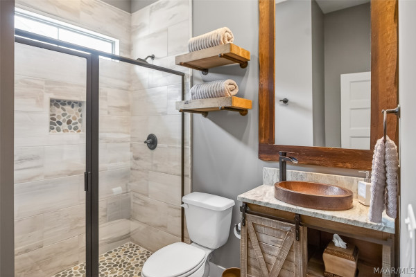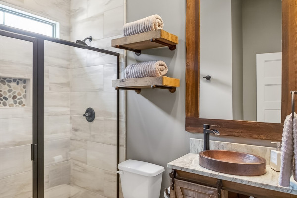 The open great room is anchored by a full stone gas fireplace with a cedar mantle and flows seamlessly into the main living spaces, finished with designer hardwood flooring. Solid-core double barn doors lead into the primary suite, where the spa-inspired bath features a freestanding soaking tub, frameless glass shower, dual vanities, and elevated finishes.