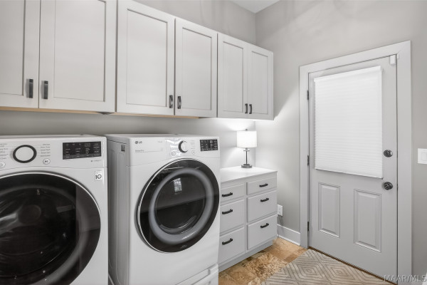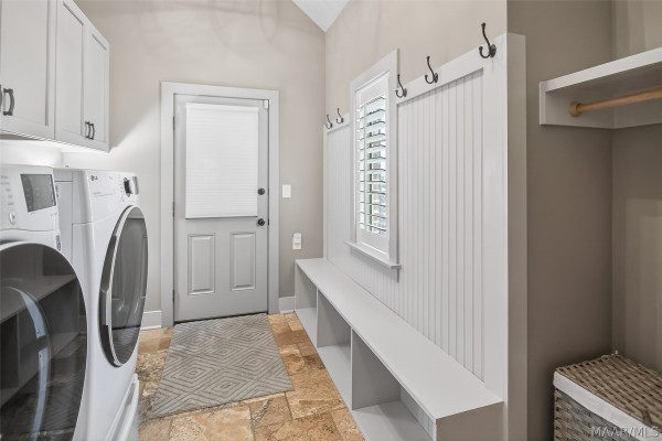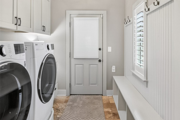 The home is equipped with dual HVAC systems, a tankless water heater on the main level, and a 40-gallon water heater upstairs. The laundry room features custom cabinetry and a built-in boot bench.