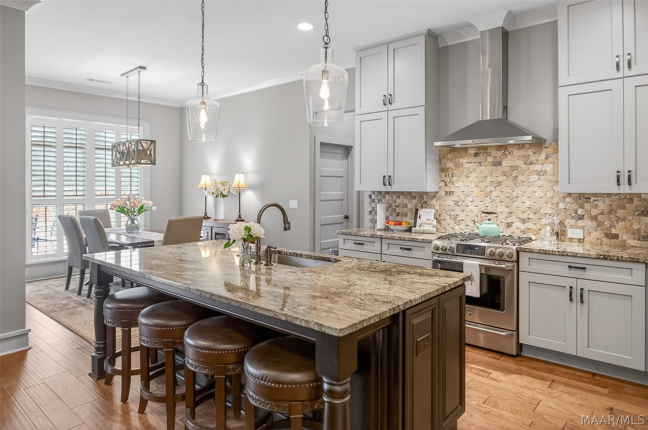 At the center of the home, the kitchen is designed to impress with a generous island, upgraded granite countertops, travertine backsplash, gas range with warming drawer, custom stainless steel hood, and double-stacked cabinetry. A custom walk-in pantry with wood shelving provides beauty and storage, ideal for entertaining and everyday living.