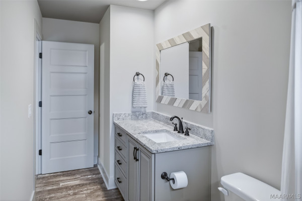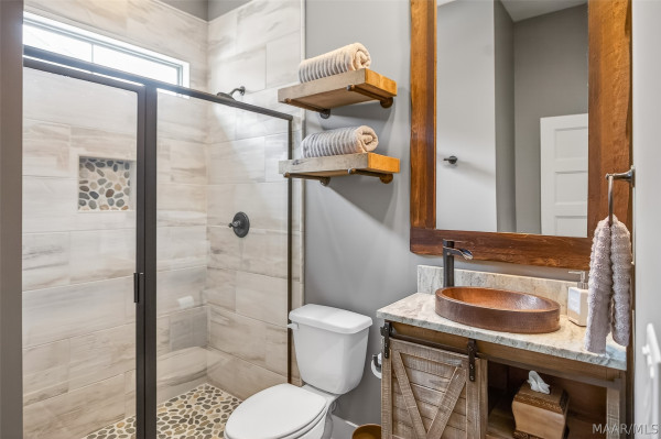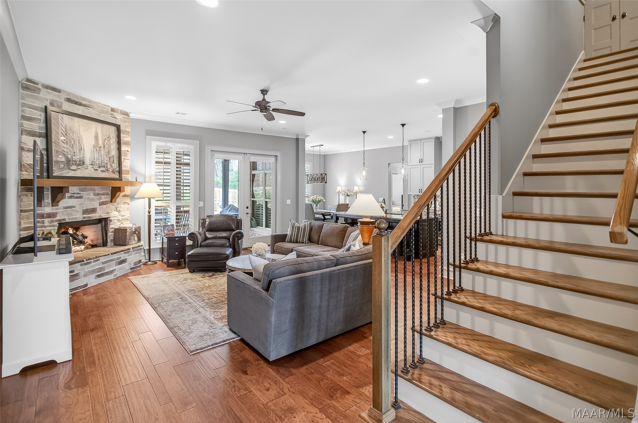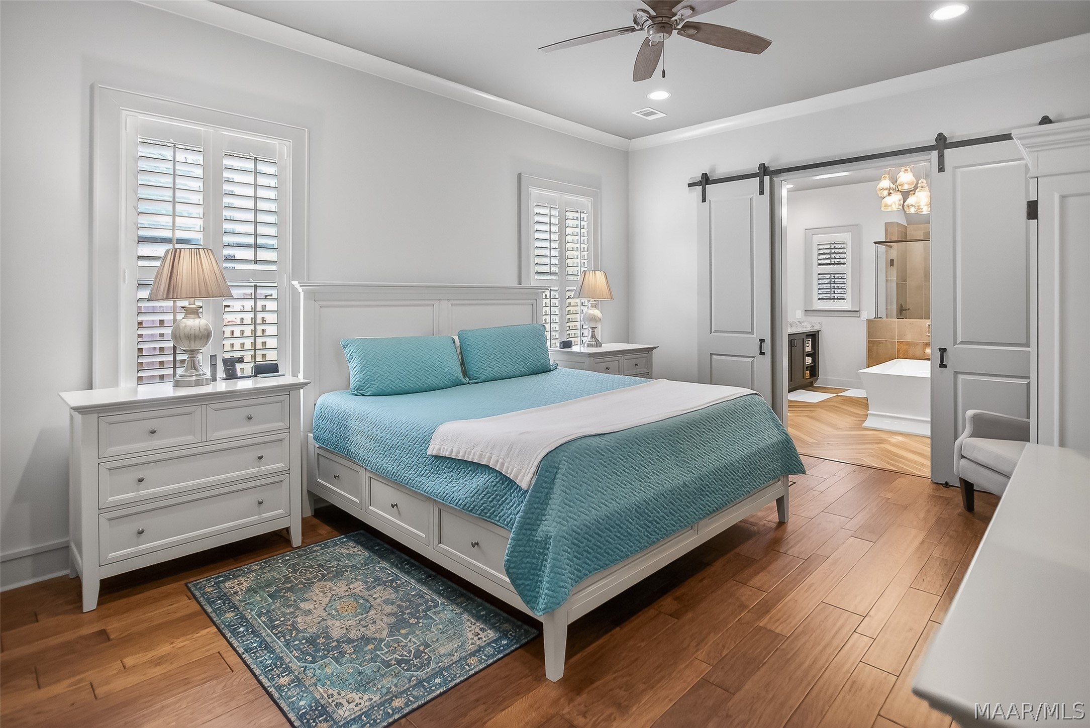 The open great room is anchored by a full stone gas fireplace with a cedar mantle and flows seamlessly into the main living spaces, finished with designer hardwood flooring. Solid-core double barn doors lead into the primary suite, where the spa-inspired bath features a freestanding soaking tub, frameless glass shower, dual vanities, and elevated finishes.