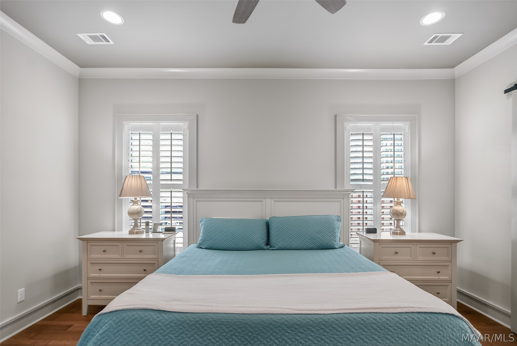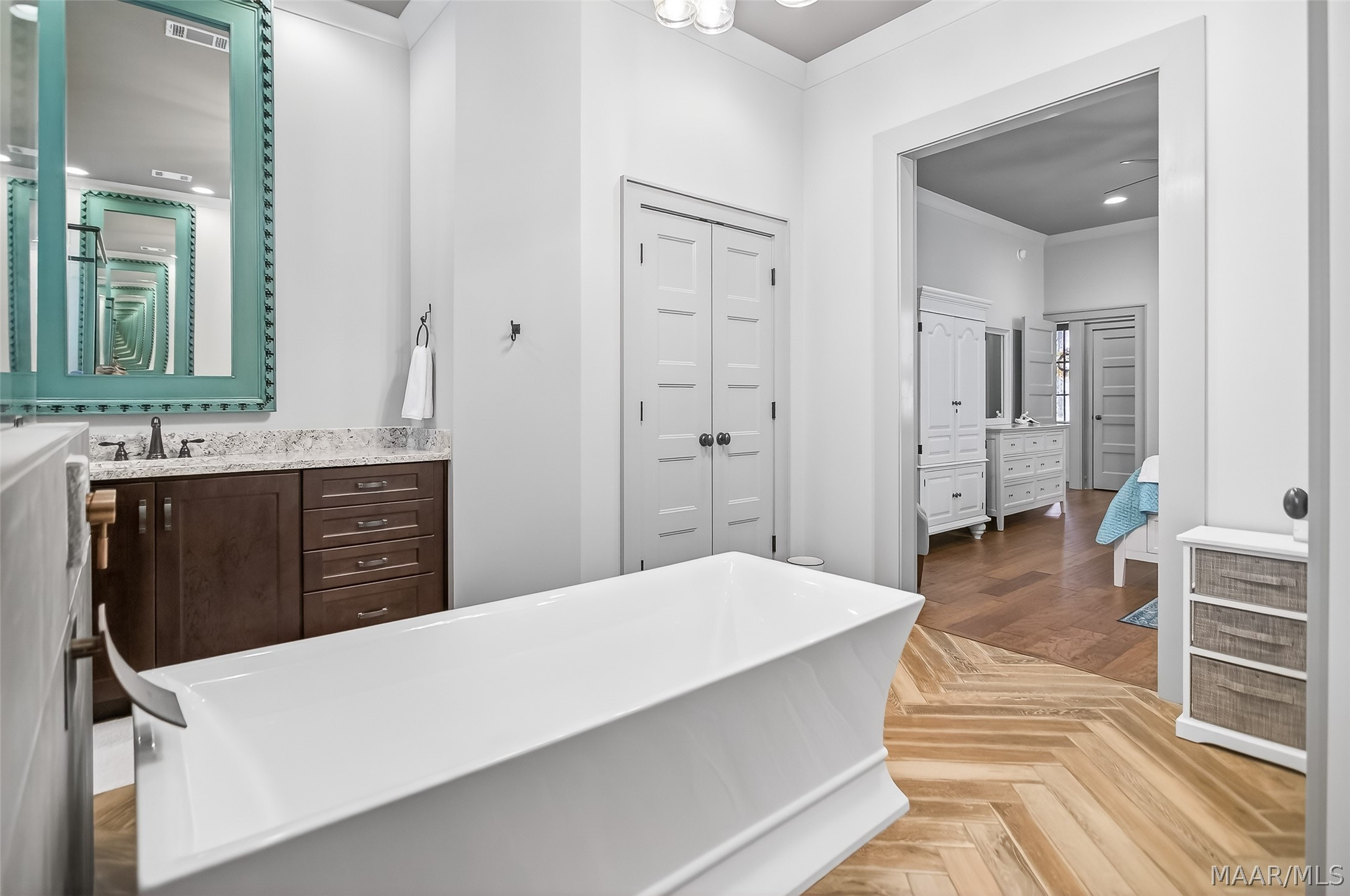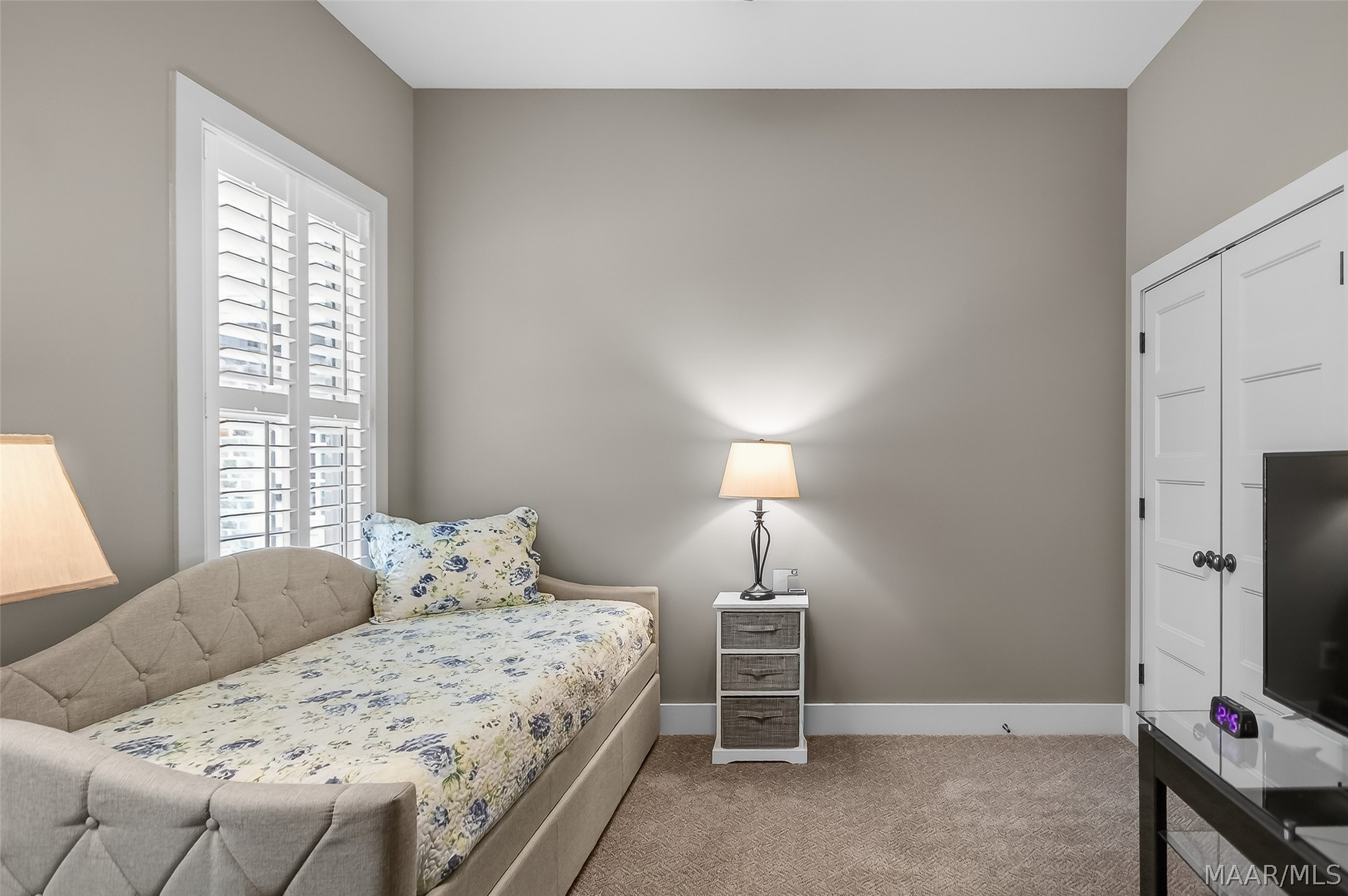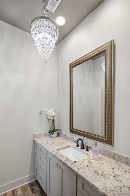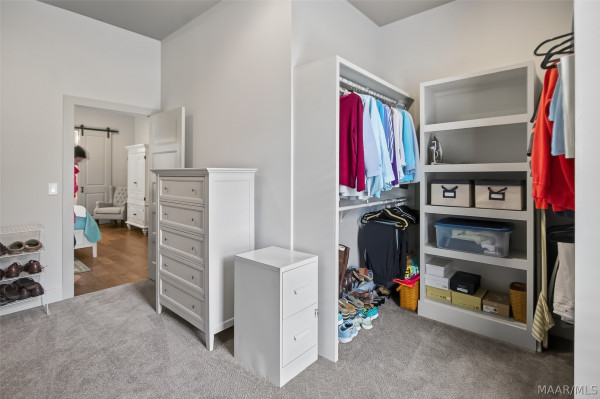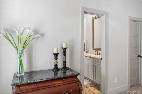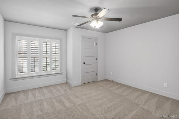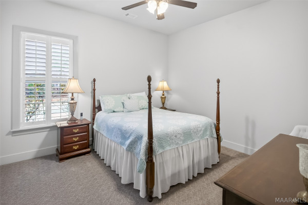 Luxury details include plantation shutters throughout, designer tile selections, upgraded carpet and pad, custom mirrors, statement lighting, and abundant storage, including two walk-in attic spaces, one with built-in shelving.