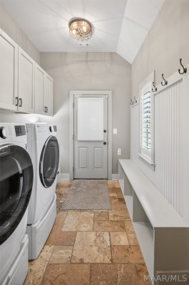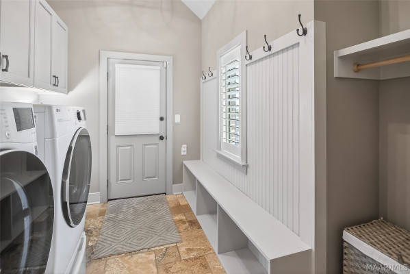 The home is equipped with dual HVAC systems, a tankless water heater on the main level, and a 40-gallon water heater upstairs. The laundry room features custom cabinetry and a built-in boot bench.