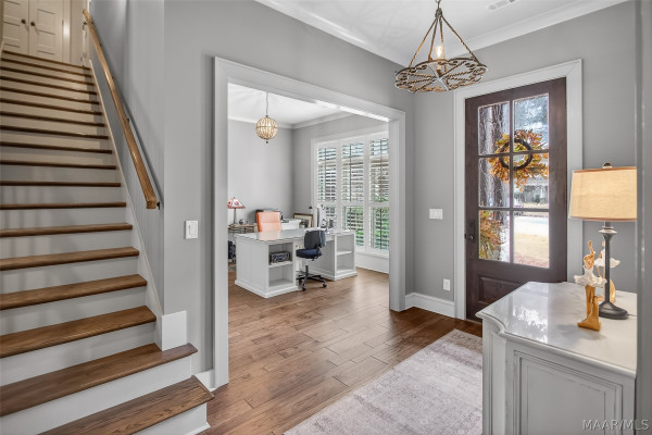 Offering five bedrooms, four full baths, an upstairs bonus room, and a versatile downstairs study or dining room, the layout is elegant and practical.