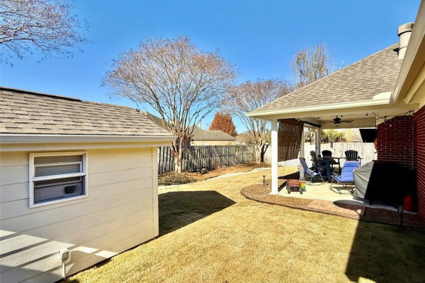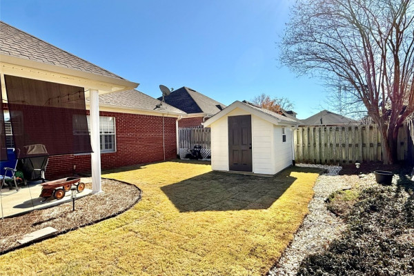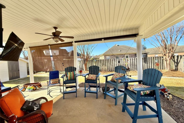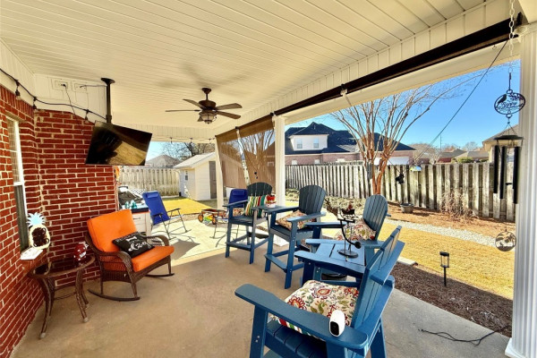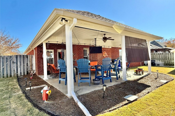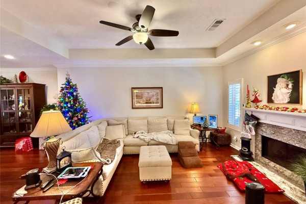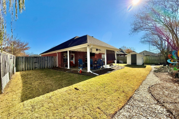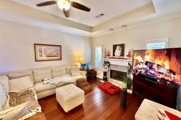 The sophisticated family room boasts a gas fireplace, creating the perfect ambiance for cozy evenings. Step outside to an impressive backyard oasis with a large covered entertaining area—ideal for hosting guests or relaxing while watching TV. Additional highlights include a newly built custom storage shed, fresh professional landscaping, and new sod.