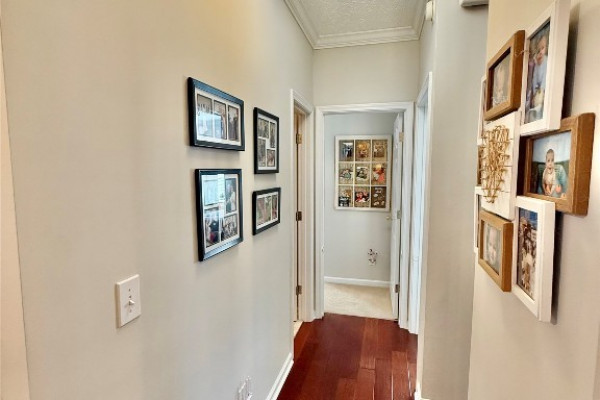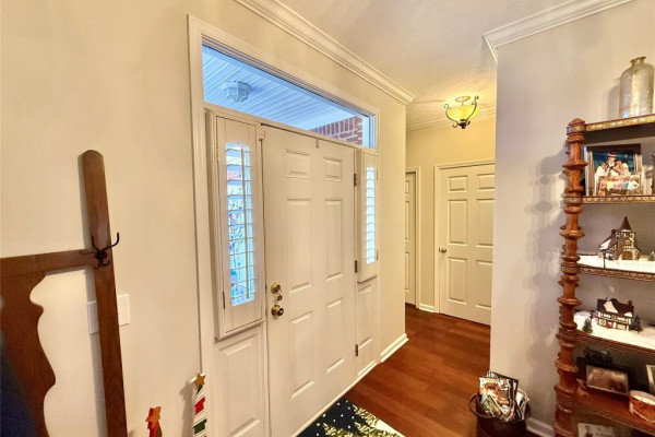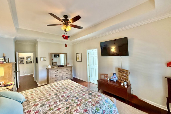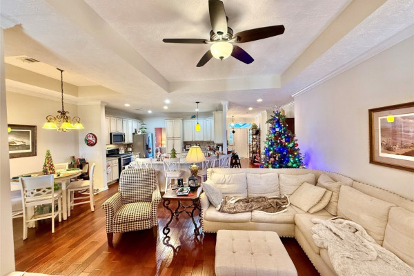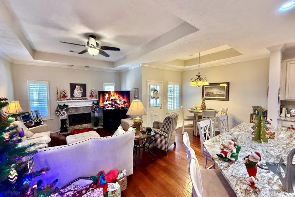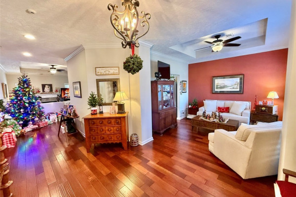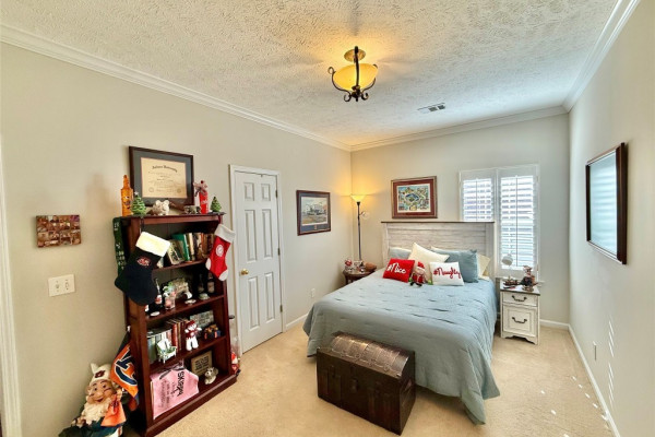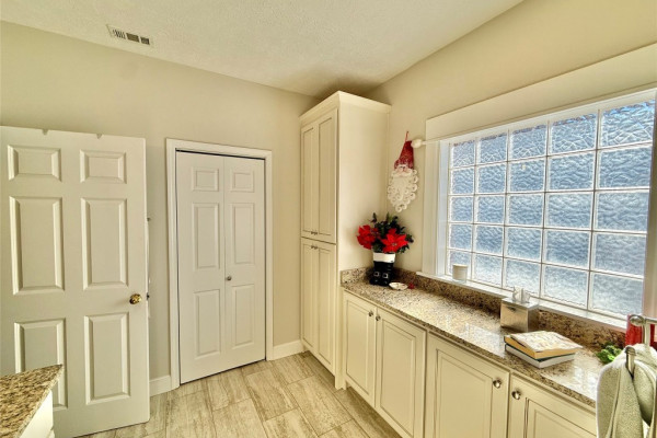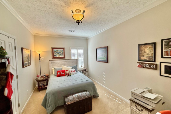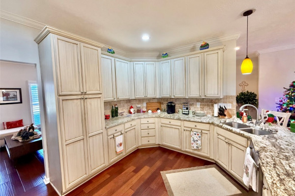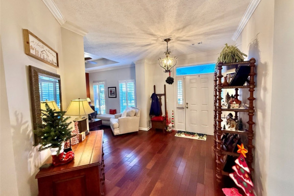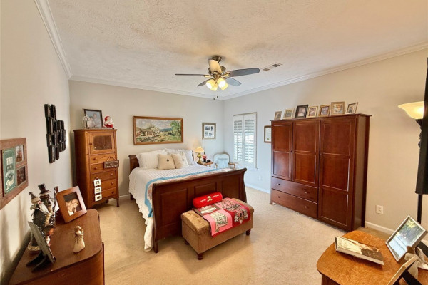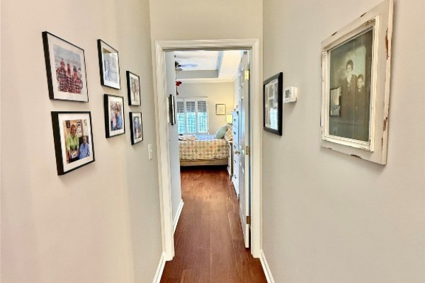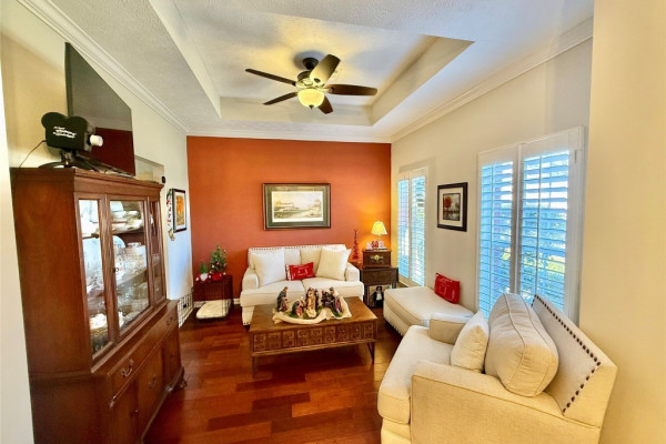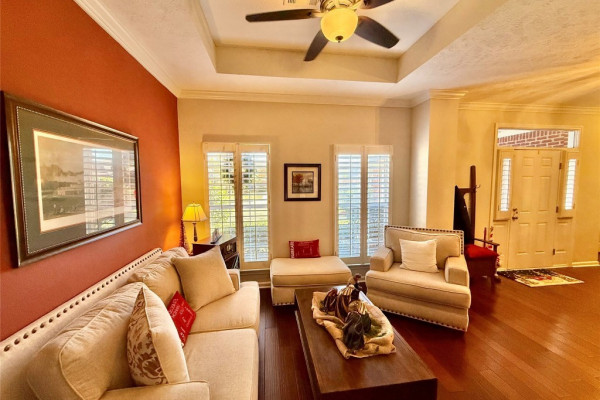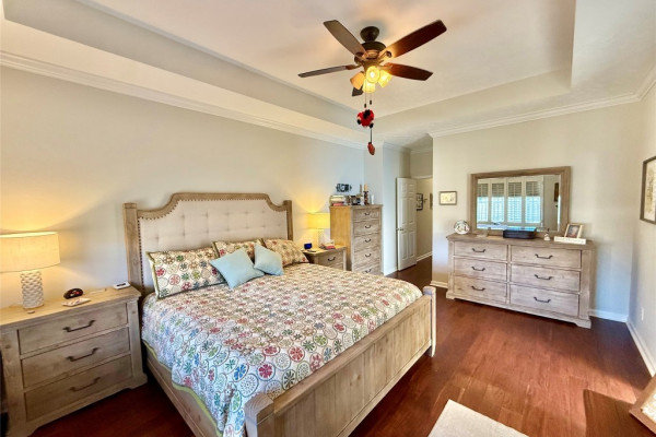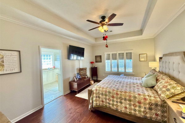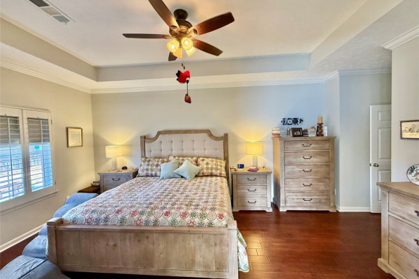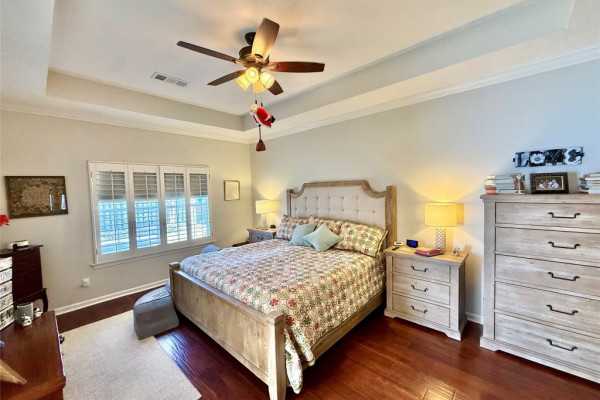 Rich wood flooring flows throughout the main living areas and primary suite. Spacious guest bedrooms offer generous storage, while the expansive primary suite provides a private, luxurious retreat. Plantation shutters add timeless elegance throughout the home.