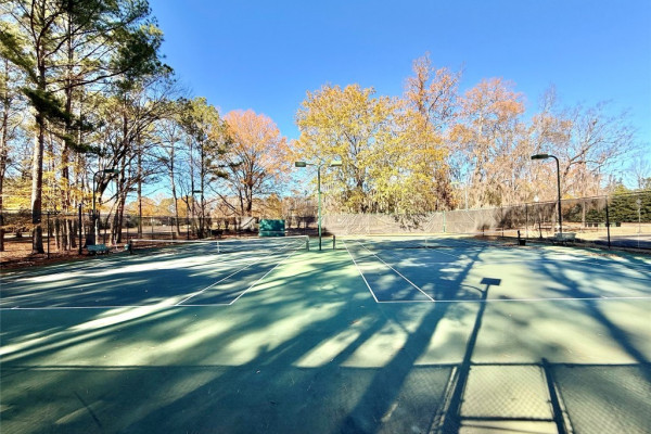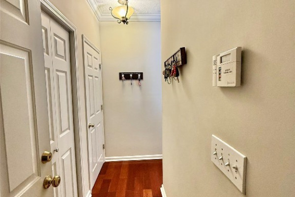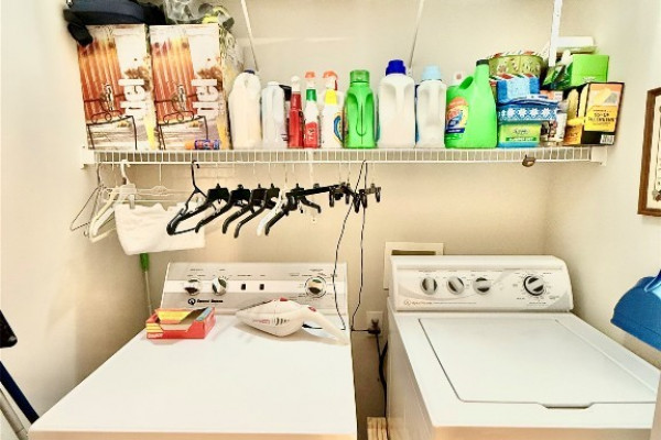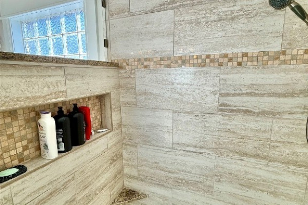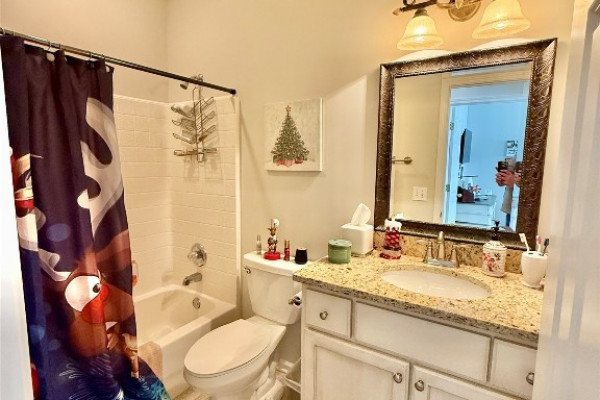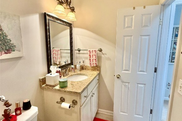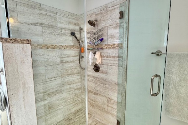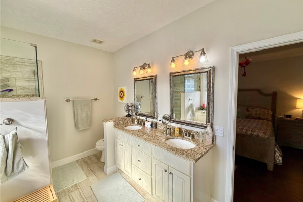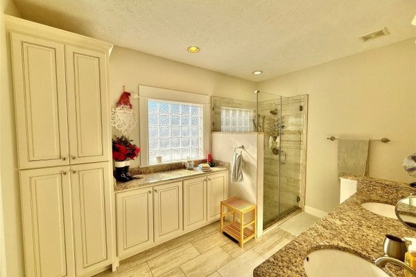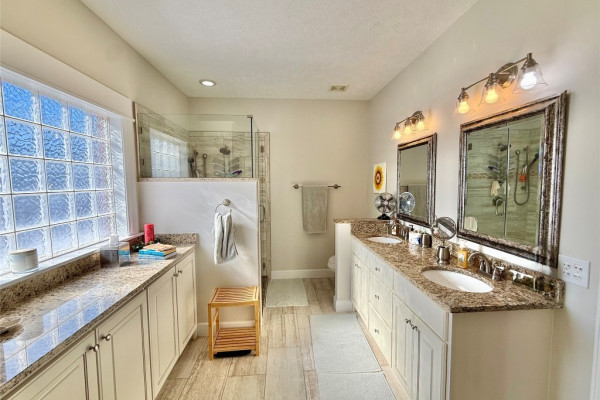 The spa-inspired primary bathroom has been beautifully renovated with custom cabinetry, a designer tiled shower, and elegant new flooring. The guest bathroom has also been thoughtfully updated with upscale finishes.