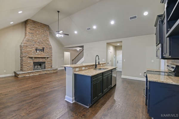 The open floor plan features a cozy stone fireplace, granite countertops in the kitchen and bathrooms, a large walk-in kitchen pantry, breakfast nook, separate dining area, and a spacious laundry room. The master room is a true retreat with a garden tub, separate shower, dual vanities, and an oversized walk-in closet.